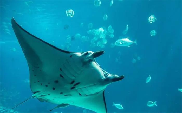 大洋蝠鲼的胸鳍像翅膀一样长,可长达7米,这有助于它们在水中优美地移动,毫不费力地滑行寻找食物或休息地点。