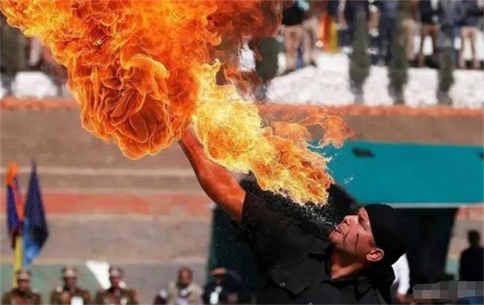 从网络视频来看,一些杂技艺人会直接拿着火把,然后从嘴里迅速喷出可燃物,实现“喷火”的画面效果,但这种情况不是我们讨论范围以内,除了现成的火以外,当速度达到一定程度,足够的热量也可以点燃可燃物质,从而实现喷火。