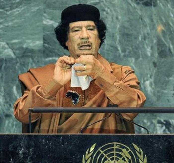 卡扎菲的这句话出来也让全世界各国领导人惊呆,卡扎菲的这句话很显然是在指责联合国和美国。不过卡扎菲根本没有在意并继续说,联合国在1945年成立以后,世界上总共发生了65场战争,联合国也并没有阻止过其中任何一场,这完全就是给五个常任理事国建造的牟利的机构而后卡扎菲将联合国宪章拿出来撕掉,这等于是在挑衅加入联合国的各个国家。