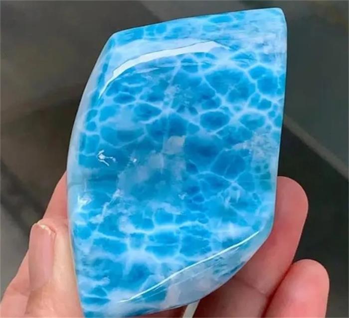 当然,克拉的重量是不言而喻的,越大越好。清洁度是指内部缺陷和杂质的数量。在阳光下观察时,裂纹、斑点、杂质和其他缺陷越少越好。颜色是最重要的,不仅颜色越蓝越好。宝石上的图案更像是大海中的波浪,它们肯定更受欢迎。通常,海纹石有几种类型,如淡蓝色、天蓝色和亮蓝色,其中亮蓝色的质量最高,而有些是蓝绿色的。如果绿色是主色调,则质量稍差。简而言之,蓝色基底和白色波浪之间的对比度越强越好。宝石切割受到珠宝商和设计师的约束,因人而异。与钻石不同的是,它不需要光线在内部充分反射和折射来展示其耀眼的效果。海纹石的设计只需要确保足够的透明度,并突出波浪的纹理。
