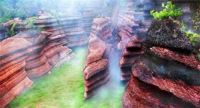 在一个相对开阔的空间里,附近有几座五里石峰。它们就像佛手柑,手掌纹理清晰,手指关节突出。在红石林中,有许多峡谷、溪流和泉水,还有地毯般的草坪和古老的紫藤花。与红石林一起,形成了一个美丽精致的天然园林。