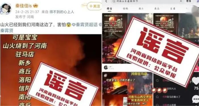2月25日,微博用户@秦佳佳is和某社交平台用户奶油小泡付,不断在账号中发布山火烧到河南的这些信息,根据网上的配图显示山火已经烧到了驻马店、新乡、商丘、洛阳、信阳、南阳等区域。信息发布之后遭到网友疯狂转发。而这则信息很快引起了河南省网络辟谣平台的注意,随即核实该则信息的真实性。确定是遥言之后赶紧辟谣,以免引发公众恐慌的情绪。