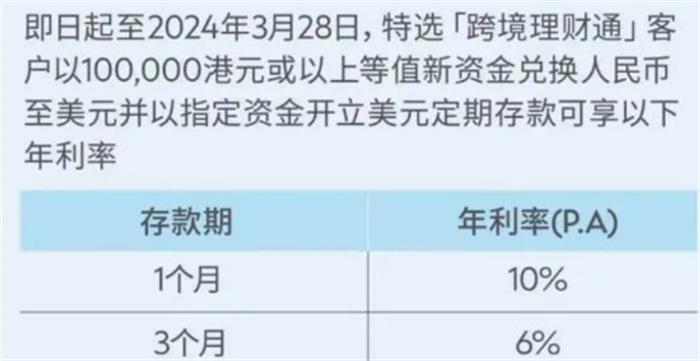 在工行开通跨境理财通南向通的业务,储户就能享受到在工商银行购买南向通定期存款,利率同样能够达到10%。除了购买美元定期存款项目之外,工商银行还给储户提供短期的利息比较高的港元以及人民币存款。