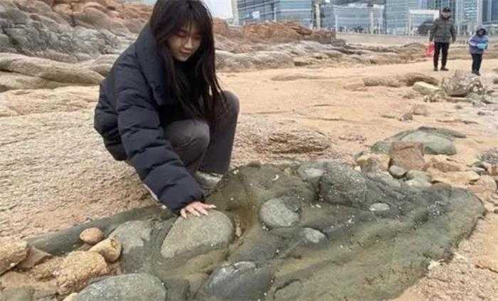 2月29日中午退潮的时候,记者来到了网友所说的第三海水浴场附近的礁石区,看到了网友视频中所出现的生物化石,这块石头呈灰褐色大约两米左右,在一条狭长的灰色石带中,而这条灰色的“生物化石”里面有包裹着一些球状的石头。礁石区上的人并不多,并没有人注意到脚下的石头颜色究竟有什么不一样,还是在记者的提示之下,有一位来自于淄博的游客才对石头产生了兴趣。