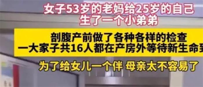 近日,一网友分享了自己53岁的妈妈,给自己生了个弟弟的新闻,引起了广泛关注。该女子表示,自己已经25岁了,对于这个刚刚到来的小生命全家人非常激动。在视频中,妈妈已经53岁了属于高龄产妇,即将生产的时候发现宝宝是臀位,还出现了脐绕颈,医生不建议顺产选择了剖腹产。
