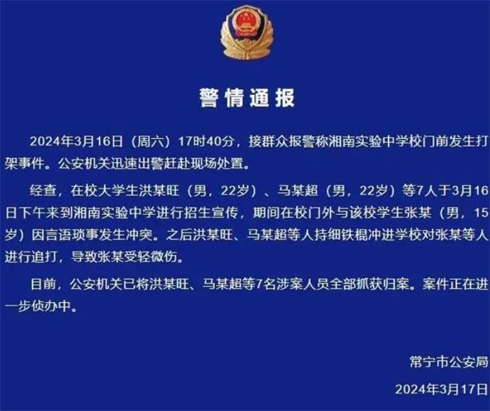 据湖南常宁市公安局通报:2024年3月16日(周六)17时40分,接群众报警称湘南实验中学校门前发生打架事件。公安机关迅速出警赶赴现场处置。