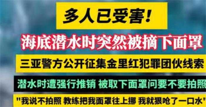 近期,位于海南三亚市所发生的一起恶劣事件迅速引起了社会各界的广泛关注,据了解,某不法团伙盘踞于三亚附近的海域,在水下以摘氧气面罩为威胁游客进行水下拍照并强制性交易,如此做法已经严重侵害了游客的合法权益。