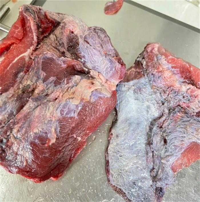 4.表面感觉:刚刚切割下来的新鲜牛肉是不会出现粘手的情况,因为此时的牛肉表面十分干燥,如果将手放在牛肉表面发现牛肉十分湿润且粘手时,此时的牛肉已经开始变质。