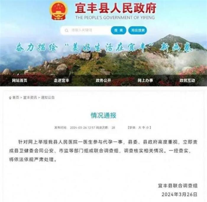 26日,宜丰县人民政府官方网站发布通报,称针对网上举报情况,县卫健委会同公安、市监等部门组成联合调查组,调查核实相关情况,一经查实,将依法依规严肃处理。