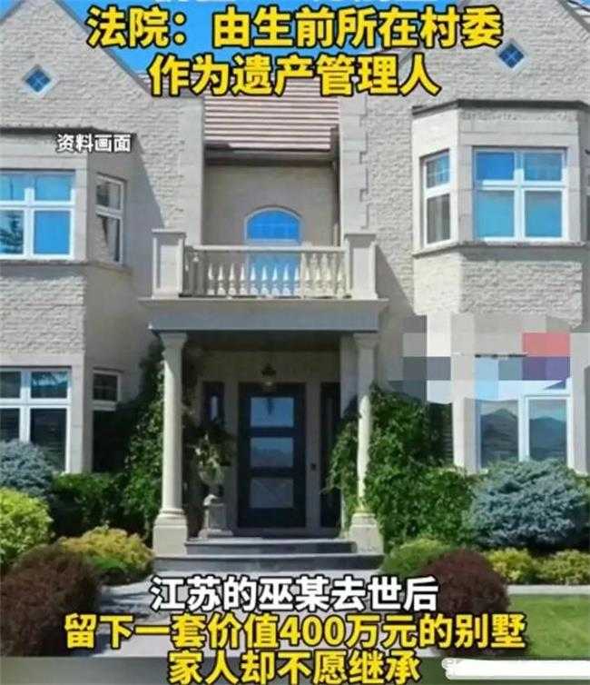 不久前无锡的巫某去世,留下了价值400万元的别墅,因巫某经商欠债无人继承,巫某生前所在村委作为遗产管理人,负责理清她的财产与债务,让债权人和获得公平的赔偿。无锡市锡山区人民法院法官助理贺豪杰表示:“巫某是在外地经商的一名商人,但她因经营不善欠下了巨额债务,锡山法院有债权人不久前起诉她偿还所有的借款,但巫某去世了,最后的遗产只剩下了这套房子。”