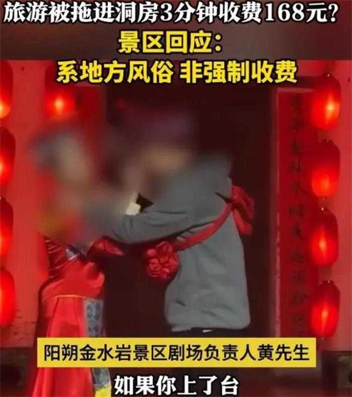 这起事件的起源在于博主参与景区内的婚俗表演后,被引导进入一间小房间进行“洞房”环节。在过程中,一位女演员为博主倒了一杯象征着美好祝愿的茶水,但随后却被告知这杯茶水要收取高达168元的费用。这一消息曝光后,立即引发了广泛讨论,许多网友表示对这样的收费方式感到不满。