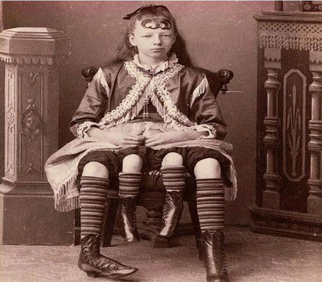 美国的 Myrtle Corbin 出生时就双臀畸形,腰部下来两边分别有一个独立的骨盆,内侧的两条小一点的腿分别和外侧的大腿各自连在一起,成为一对。她曾经靠内侧的两条 “多余的腿” 移动过,但因为太虚弱根本走不动。她的奇特身体状况引起了广泛关注,也让人们对生命的多样性有了更深刻的认识。