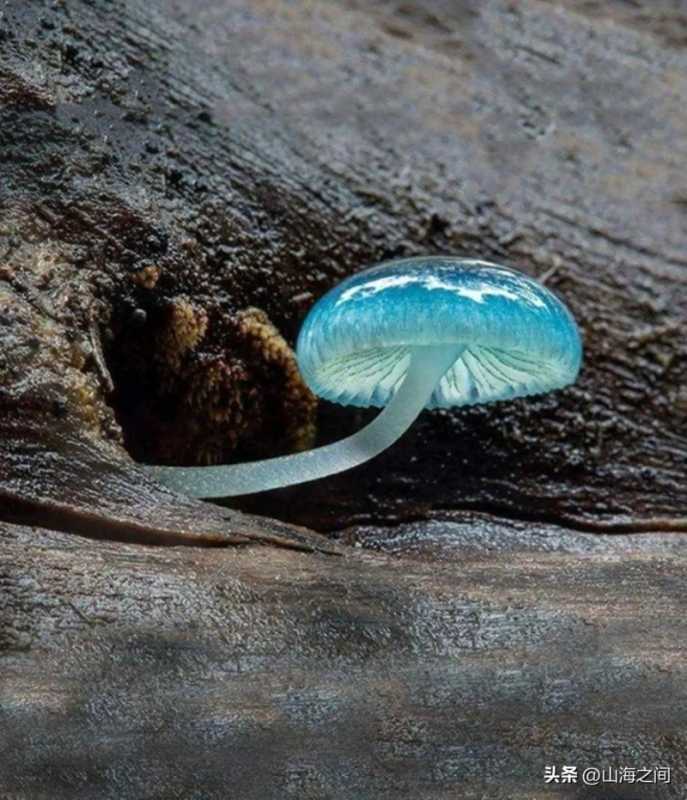 一朵自然生长的淡蓝色透明蘑菇,看起来像是一件精美的艺术品,但这种颜色的蘑菇一般毒性都很强