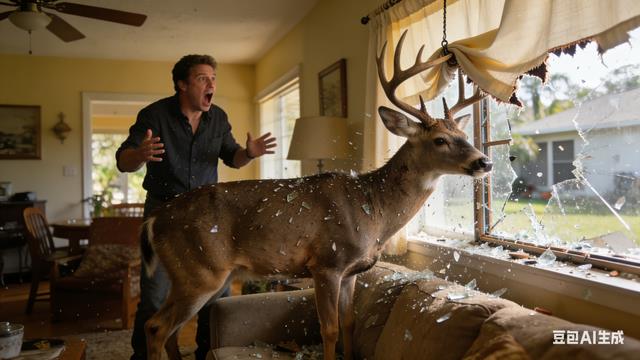 佛罗里达小鹿撞破窗户闯民宅,鹿角挂窗帘社死现场,主人全程看呆