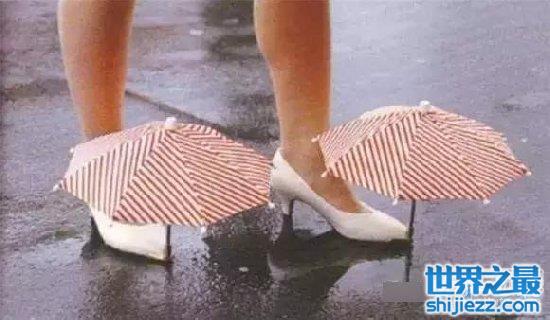 因为怕雨打湿鞋背,所以给穿高跟鞋的女士设计了这样的小伞:画面太美,我不敢看。