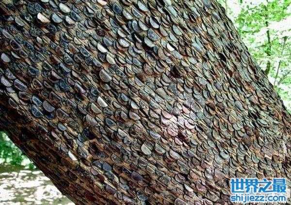 英国北约克郡的几棵树的树干中密密麻麻的“长”满了硬币。据悉在几个世纪前,不少过路人用石头把硬币砸进树干,以求自己的好运气,或有情侣将硬币砸进树中代表两人情深不渝。几百年后,树渐渐长大变粗,原本被砸进树干里的硬币又重见天日,随着树长了出来。这可是真正的“摇钱树”啊。