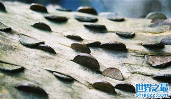 图中这些钱币牢牢地嵌入树干中,依据几百年前的风俗,一位病者如果将一枚硬币嵌入树中,那么他的疾病将消失。反之,如果某人将树干上的钱币拔出,那么他将生病。