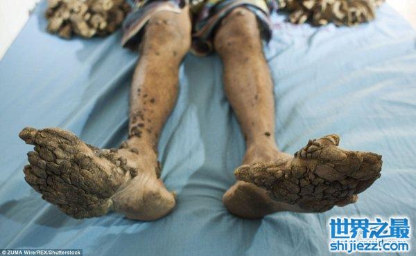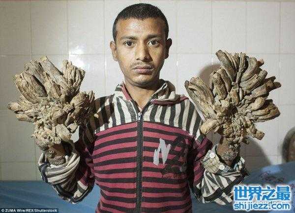 25岁的“树人” 阿布.巴煎蛋来自孟加拉库尔纳,因患罕见疣状表皮发育不良症,一种罕见的遗传性皮肤疾病,在过去的七年间手脚部位长出了树根状疣状组织。