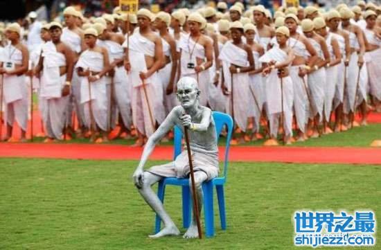 这张照片是在印度班加罗尔的体育馆拍下的。这些印度学生正要打破“世界上最多人打扮成甘地聚在一起”的吉尼斯世界纪录。