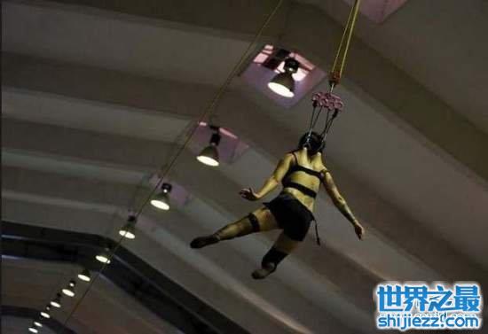 这名女性是拉丁美洲刺青与穿环协会的成员,她在自己的背上穿了环,所以吊索是直接勾着她背上的环…这样不痛吗?