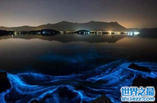 这个景象是在香港的三门仔海滩拍下的,这种奇特的景象是因为海中的夜光藻而产生。