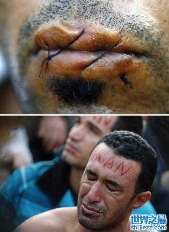 其实这名伊朗籍的移民是故意把他的嘴唇缝起来为了想要抗议他们无法逃离到其他的国家。