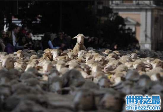 这些羊群正要通过马德里市政厅,去参加牲畜迁徙庆典。