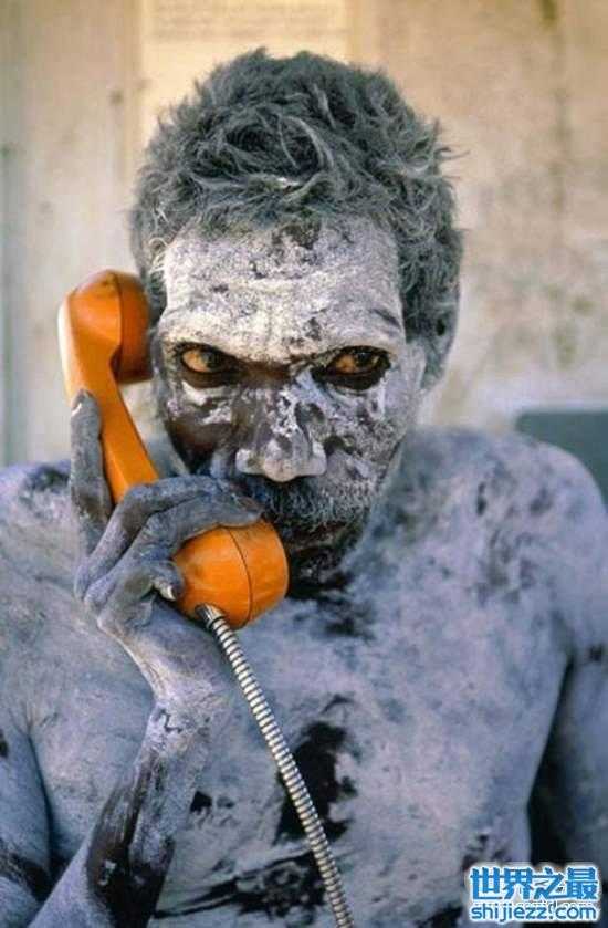 他是澳洲阿纳姆地的土著,第一次拿起新装好的现代电话。