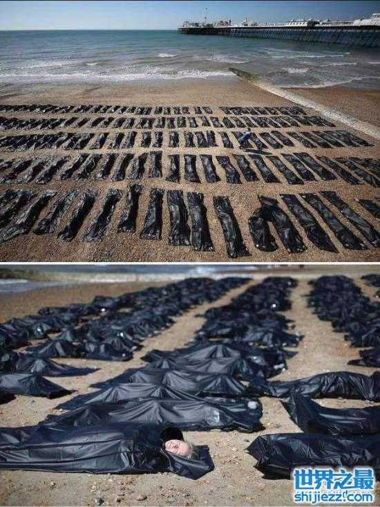 别怕,这些袋里装的都是活人。这是慈善组织Amnesty International为了唤醒大家对欧洲移民危机的重视而举办的活动。因为中亚居民在移民途中很容易被淹死。