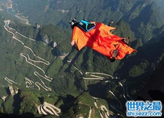 这个人正穿着飞鼠装在中国天门山上滑翔。