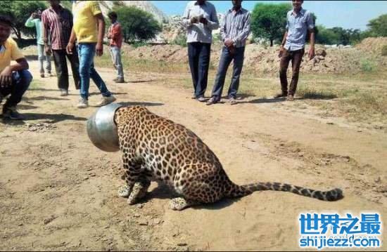 其实这只花豹是喝水的时候头不小心卡住了。