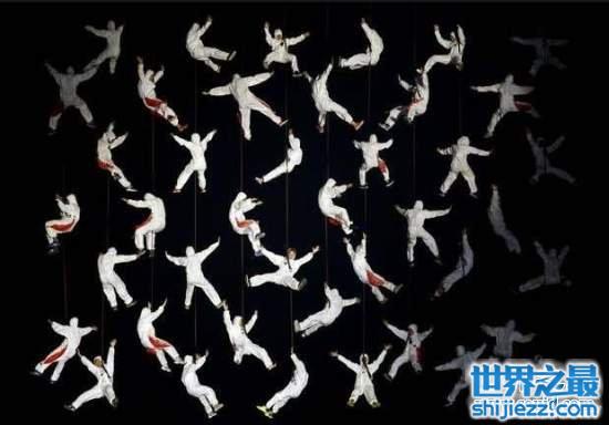 其实他们是新加坡自愿参与演出的人,所以被悬吊在一条河上呈现一段舞蹈表演,庆祝新加坡独立50周年。
