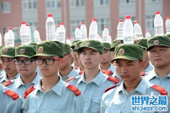 其实是河南郑州一所学院的新生,头顶着水瓶练耐力。