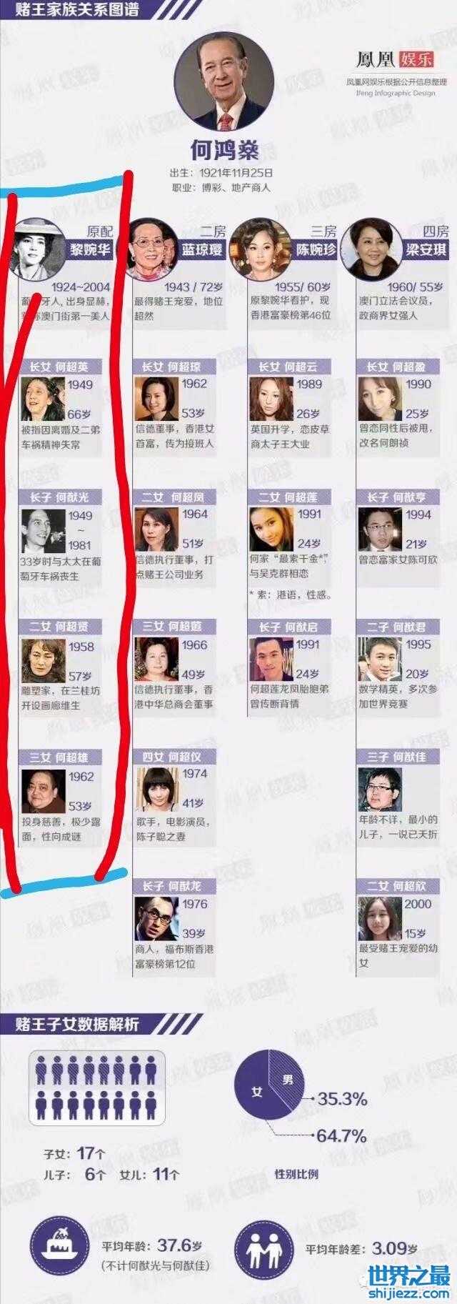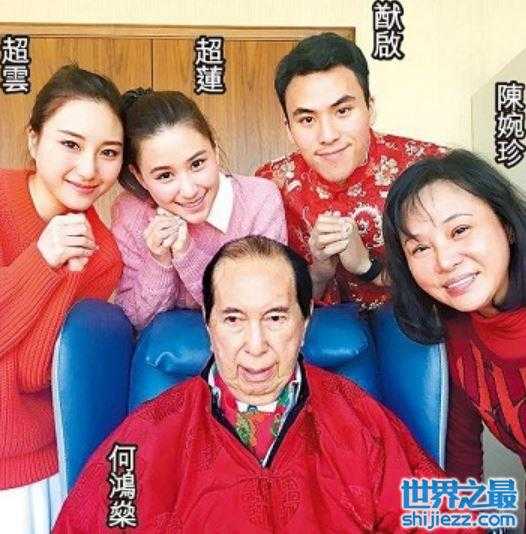 何鸿燊借由自己创办的澳门博彩控股有限公司 (SJM Holdings) 在澳门这个全球最赚钱的赌场王国创造出极大收益,他的事业版图还包括旅游、博奕、航运、地产等休闲娱乐产业,身家逾5000亿港元。赌王膝下共有12个孩子,大房有3个、二房5个、三个3个、四房4个,其中大家熟悉的何超莲、何猷启是由三房生下,去年才结婚的资优生何猷君则是四房的孩子。