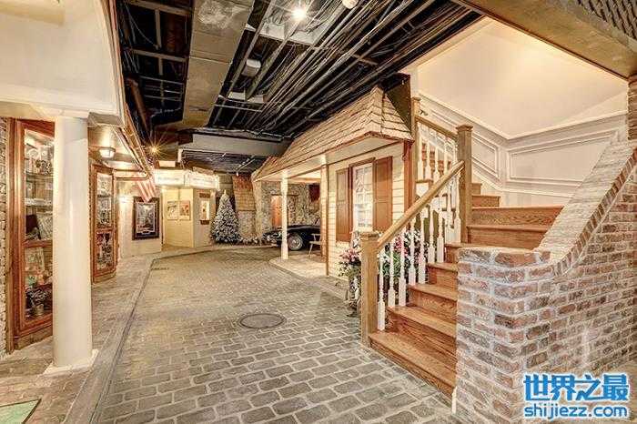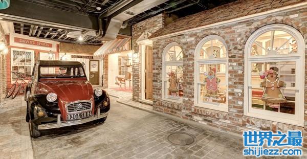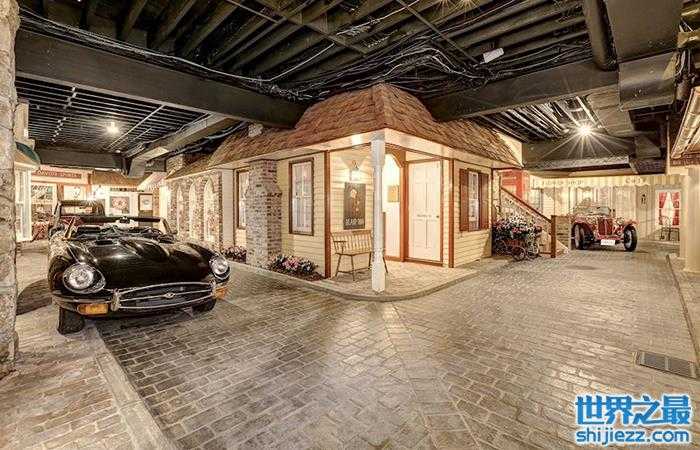 这栋豪宅的地下室装修最令人惊艳,街道上铺满鹅卵石,还有糖果屋、电影院、花坊、运动用品店,从橱窗也可看到里面的商品陈设,路上还有3台不同款式的老爷车。