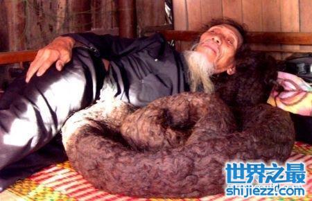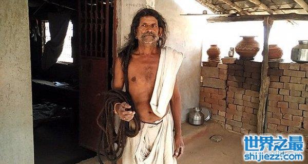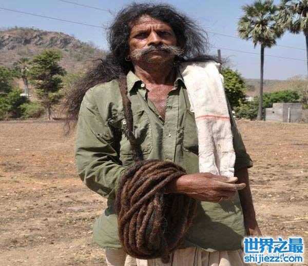 从远处看,Sjibhai Rathwa的右手臂上就像缠了一道黑色的长绳子一样,但其实这只是他那仍在生长的、约19米长的头发做成的一根厚厚的骇人长发绺而已。而目前吉尼斯世界纪录中,世界上最长的头发是一名美国女子,其头发长达16.7米。如果Sjibhai申请吉尼斯的话,那么他将是拥有世界上最长头发的人。