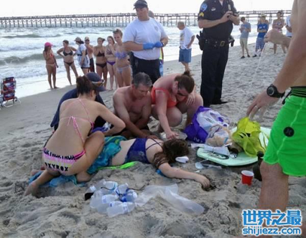 北卡罗来纳州发生鲨鱼袭击事件,紧急救援人员帮助遇袭者。
