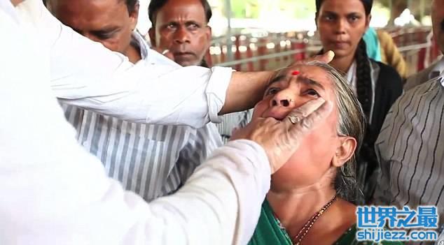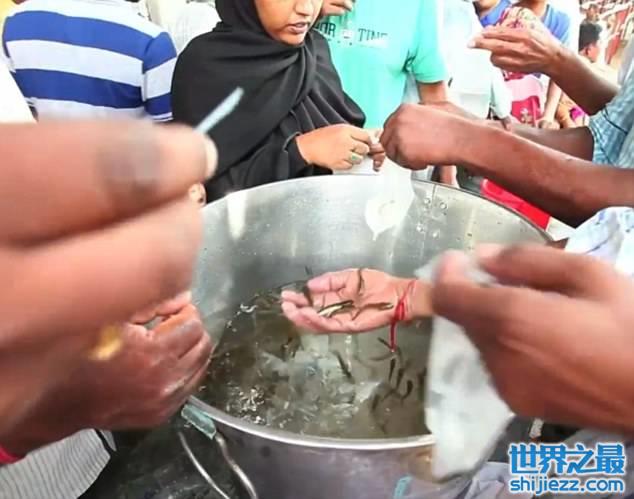 虽然生吞活鱼听起来让人生畏和作呕,却仍有成千上万的印度人民慕名前往,其中不乏许多父母带着孩子前去接受治疗。他们不远万里,纷纷前往南部城市海得拉巴参加这个节日“盛典”,只为生吞活鱼治疗哮喘。孩子通常会对此心生畏惧,只有在大人们的控制下才被迫服下活鱼。生吞活鱼后,他们会呕吐不已。