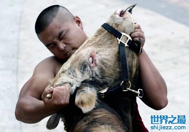 (奇趣网 www.QiQu.net 收集发布)现场气氛热烈,喝彩声此起彼伏,有壮汉更成功两度徒手摔倒350公斤公牛。