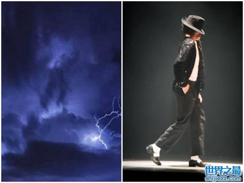 雷雨云中的身影(左图),激似迈克尔杰克逊在空中施展舞技(右图)。