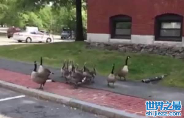 美国波士顿加拿大雁摆出阵形包围保护小雁不让喵星人偷袭