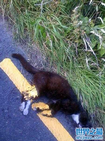 据报道,当时有一名摄影师正好路过该地,看到道路上一条黄色标线的一段竟然画在一只死猫的腿上,于是他将这一场景拍下,并将照片发布到网上。等他再度返回查看时,小猫的尸体已被移走,地上的路标显得残缺不全。