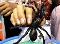 油炸大蜘蛛,肉质肥硕鲜美,是近几年柬埔寨最流行的小吃。据说,除了味美,这种蜘蛛还可用来治疗后背疼痛和儿童呼吸系统疾病,当地人因此把蜘蛛泡在酒里服用。