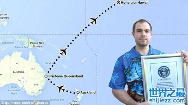 这一趟旅程的实际飞行时数是13小时又10分钟。但因为飞机飞越过国际换日线(International Date Line),结果就像时光倒流一样,他这一天就比其他人多了将近一 整天时间,足足度过了46小时。打破了一名巴基斯坦人于1998年创下的35小时25分钟的旧纪录。