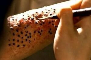 差点就在电影院里吐了出来,于是就有网友将这张毛孔芝麻女孩的恐怖图片曝光,据说是要恶心一下别人,从图片中可以看出整个胳膊毛孔中全是芝麻,女主人公还拿着针,仔细讲这些芝麻给挑出来,估计一些密集恐惧症的人已经不敢在看下去。