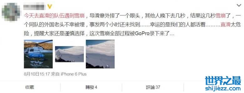 据悉,该名中国人事发当日将影片及照片上传微博,并讲述事发经过:“今天去直滑的队伍遇到雪崩,导滑意外摔了一个跟头,其他人晚下去几秒,结果这几秒雪崩了,一个同队的外国老头不幸被埋,事发两个小时还未找到……幸运的是我们的人都活着………直滑太危险,提醒大家还是谨慎选择,这次雪崩全部过程被GoPro录下来了…提醒大家注意安全,谨慎滑雪。”事后,死者妻子与女儿已飞抵新西兰,处理善后。