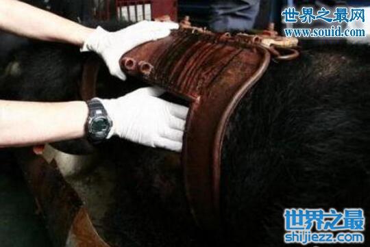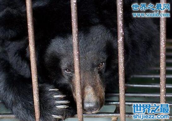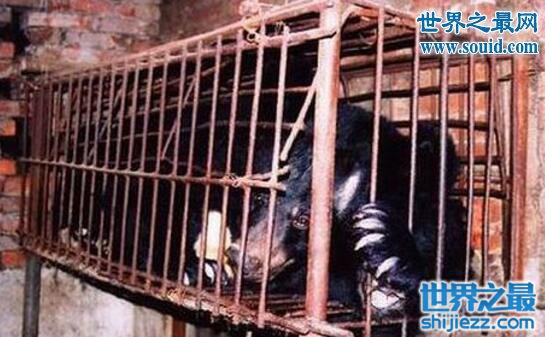 可怜的黑熊们连自杀的机会都被剥夺了!熊场的人为了防止黑熊自杀,把他们分别关在狭小的铁笼里,小得无法转身。无法活动。被抽取胆汁时,黑熊除了惨嚎,就只能拼命摇头。
