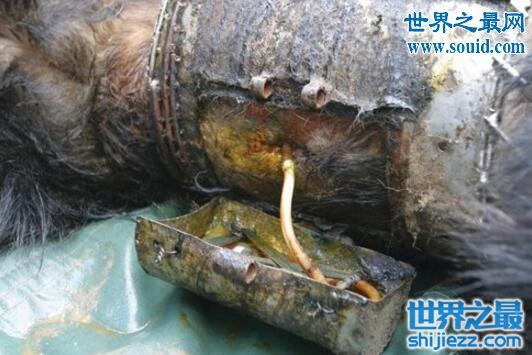 活熊取胆的方法是将一个金属管永久地插入熊的胆囊,另一端露在熊的腹部外面,因为伤口裸露在外,永不痊愈,所以经常感染,这就是永远插在熊的胆囊上用来取胆汁的金属管。