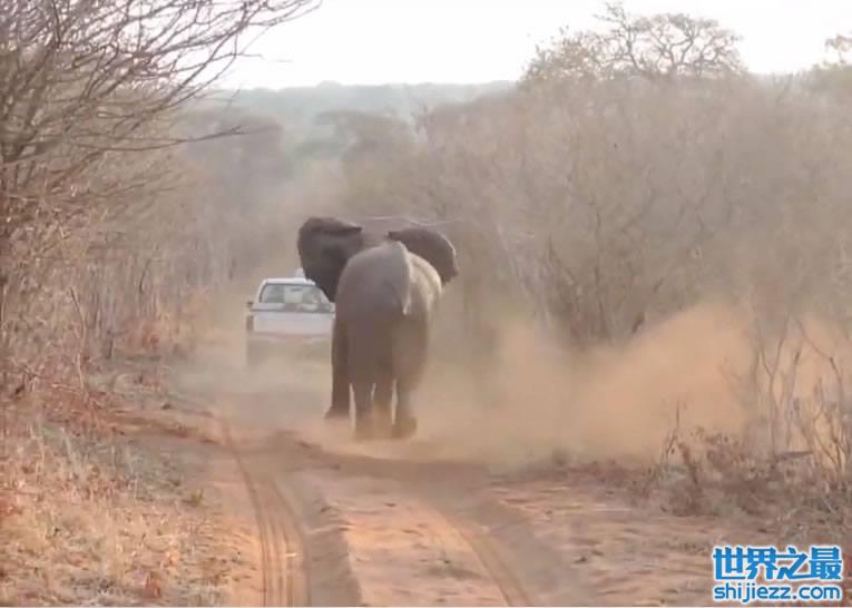 当时一班结伴到非洲旅行的人,乘坐着吉普车前往津巴布韦的维多利亚瀑布,驶经一段路时,怀疑行车的声音太嘈吵,把路旁一只大象吓倒。它立即从旁走出来,更追着吉普车跑。不过它的身形巨大,跑起来十分吃力,所以跑了一会便停下来,但已令看到这一幕的人非常吃惊。