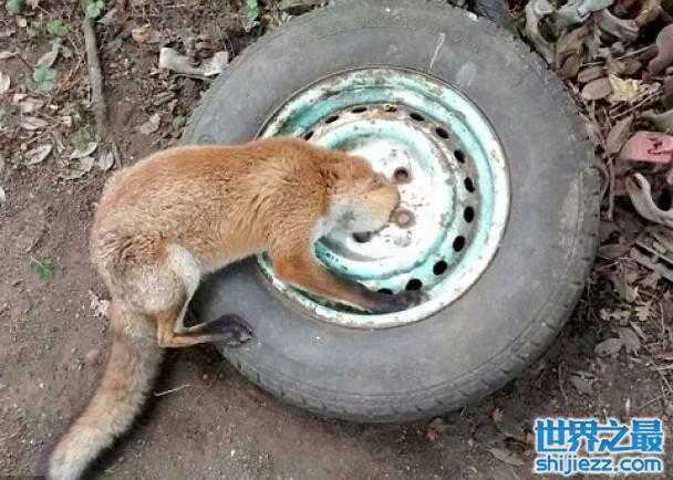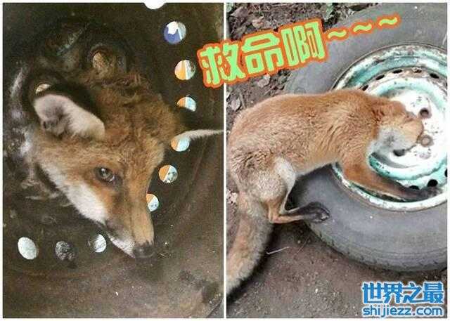 英国可怜小狐狸被恶狗追 头部惨卡轮胎